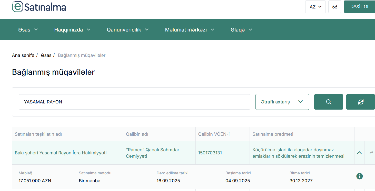 “Ramco” Qapalı Səhmdar Cəmiyyəti – Köçürülmə işləri üçün daşınmaz əmlakların sökülərək ərazinin təmizlənməsi – 17.051.000 AZN